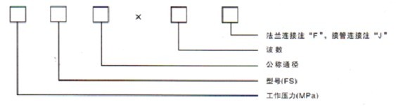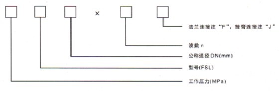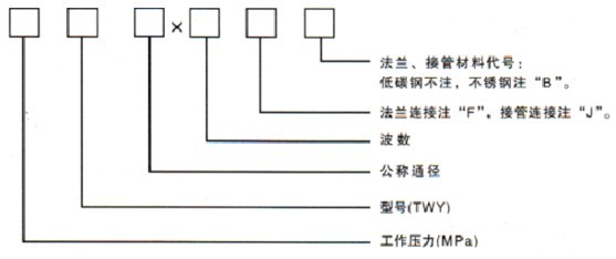 舉例:0.6TNY500TF 表示:公稱通徑為Φ500,工作壓力為0.6MPa,(6kg/cm2)波數(shù)為4個,帶導(dǎo)流筒,碳鋼法蘭連接的內(nèi)壓式波紋補(bǔ)償器。